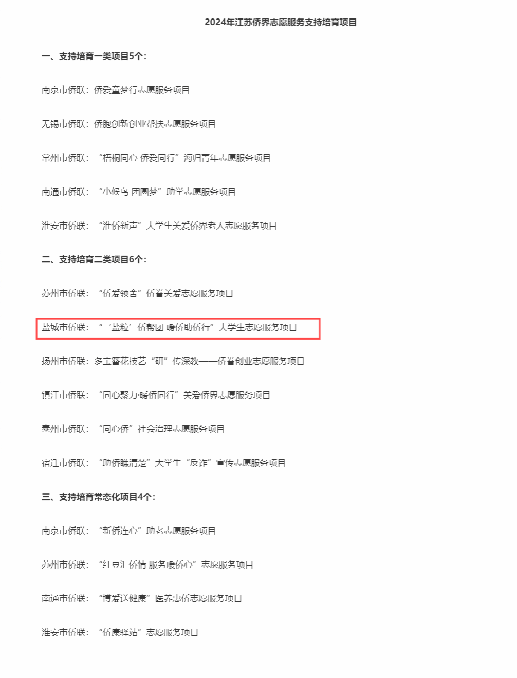 近日,2024年度江苏侨界志愿服务支持培育项目立项结果公布,公司申报的《“‘盐粒’侨帮团,暖侨助侨行”老员工志愿服务项目》获批2024年度江苏侨界志愿服务二类支持培育项目。全省共15个项目获批立项,这是继2023年《“情系归侨送温暖”老员工志愿服务项目》获得立项后,公司代表盐城市侨联再次获得该类项目立项。