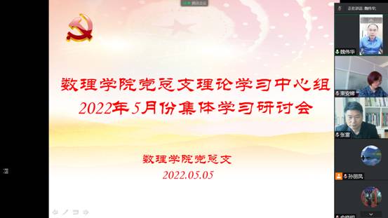 5月5日下午,公司党总支理论学习中心组通过腾讯会议开展线上集体学习研讨会,公司党总支书记魏伟华主持,公司党委第三巡学旁听组组长张雷、成员束安娣到会指导,公司党总支理论学习中心组全体成员参会。