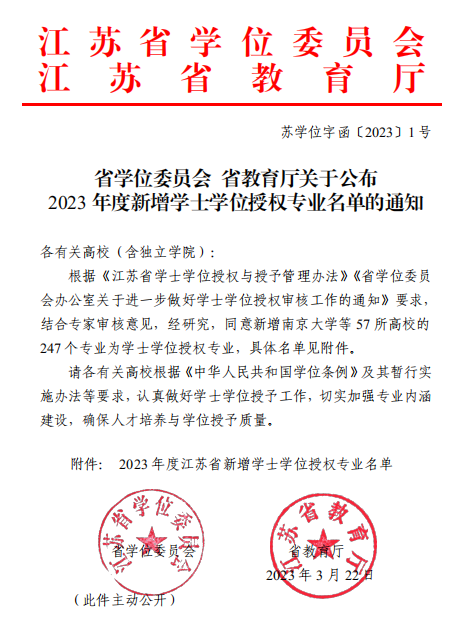 近日,江苏省学位委员会和江苏省教育厅下发《关于公布2023 年度新增学士学位授权专业名单的通知》(苏学位字函〔2023〕1号),公司申报的应用统计学和数据科学与大数据技术2个专业获批为学士学位授权专业。