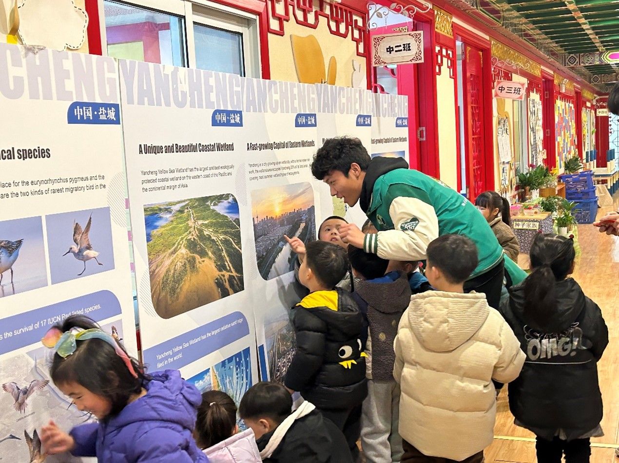 在教室外走廊,志愿者们精心布置了展现盐城湿地之美的展板,小朋友们齐聚在展板面前,有的自己认真观看展板内容,有的与其他同学交流探讨,还有的向志愿者们积极提问……现场场面十分热闹。