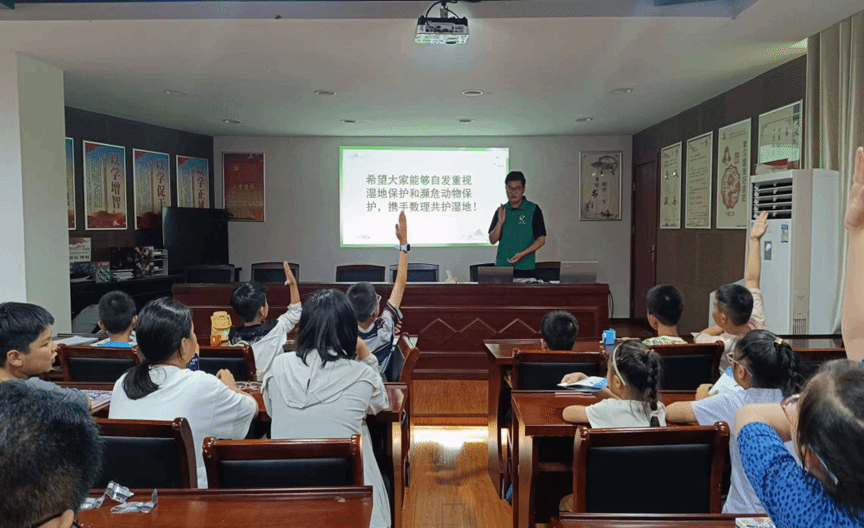 同时,志愿者们通过精心制作的宣传片和PPT,集中展示了近年来盐城湿地修复和生态文明建设成果,并就湿地的定义、类型、分布和功能等内容向孩子们进行了详细讲解。讲解过程中,志愿者们还设置了抢答环节,让孩子们在互动中加深对湿地科普知识的理解和记忆。