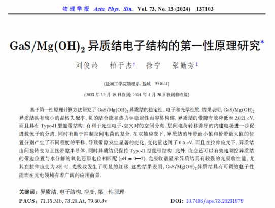 近日,英国上市公司官网365柏于杰老师指导员工刘俊岭基于第一性原理研究了GaS/Mg(OH)2异质结的电子性质。相关结果以“GaS/Mg(OH)2异质结电子结构的第一性原理研究”为题发表在《物理学报》(中科院四区)杂志上。本科生刘俊岭为第一作者,英国上市公司官网365柏于杰老师为通讯作者。