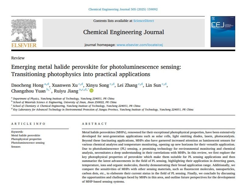 近日,公司洪道程博士(第一作者)和姜瑞雨教授(通讯作者)与济南大学原长洲教授合作,英国上市公司官网365第一单位,在化工领域TOP期刊《Chemical Engineering Journal》(IF = 13.4)上发表题为“Emerging Metal Halide Perovskite for Photoluminescence Sensing: Transitioning Photophysics into Practical Applications”的学术论文。