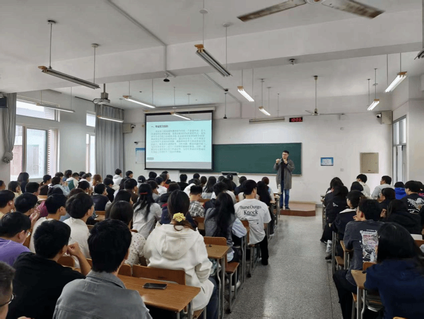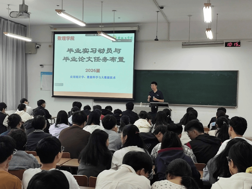 随后,应用统计系主任左冬冬就毕业论文的总体安排和进展计划作了重点介绍。他从选题方向、指导教师确定、论文进度安排、质量标准与学术规范等方面进行了详细说明。他强调,毕业论文既是对大学四年学习成果的全面检验,也是培养独立科研与分析能力的重要途径。希望同学们提早谋划、认真选题,严守学术诚信,努力完成高质量的毕业论文。
